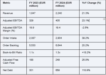 The financial performance of Hensoldt AG in FY 2024 demonstrated significant growth across key metrics when compared to FY 2023. Revenue increased from EUR 1,847 million to EUR 2,240 million, representing a robust growth of 21.3%. Adjusted EBITDA saw an even more substantial increase, rising from EUR 329 million to EUR 405 million, a growth of 23.1%. While the reported adjusted EBITDA margin saw a slight decrease from 19.9% to 19.4%, this figure for FY 2024 includes the consolidation of the ESG Group and excludes pass-through business, suggesting underlying profitability remained strong. Order intake experienced a remarkable surge of 39.2%, increasing from EUR 2,087 million to EUR 2,904 million. This strong order intake led to a 20.2% increase in the order backlog, which reached EUR 6,644 million from EUR 5,530 million. The book-to-bill ratio improved significantly from 1.1x to 1.3x, indicating strong future revenue potential. Adjusted free cash flow also saw healthy growth of 25.8%, increasing from EUR 198 million to EUR 249 million. However, net debt increased substantially from EUR 301 million to EUR 659 million, likely due to the acquisition of the ESG Group 1.5.2. Analysis of Revenue by Segment (if data permits):